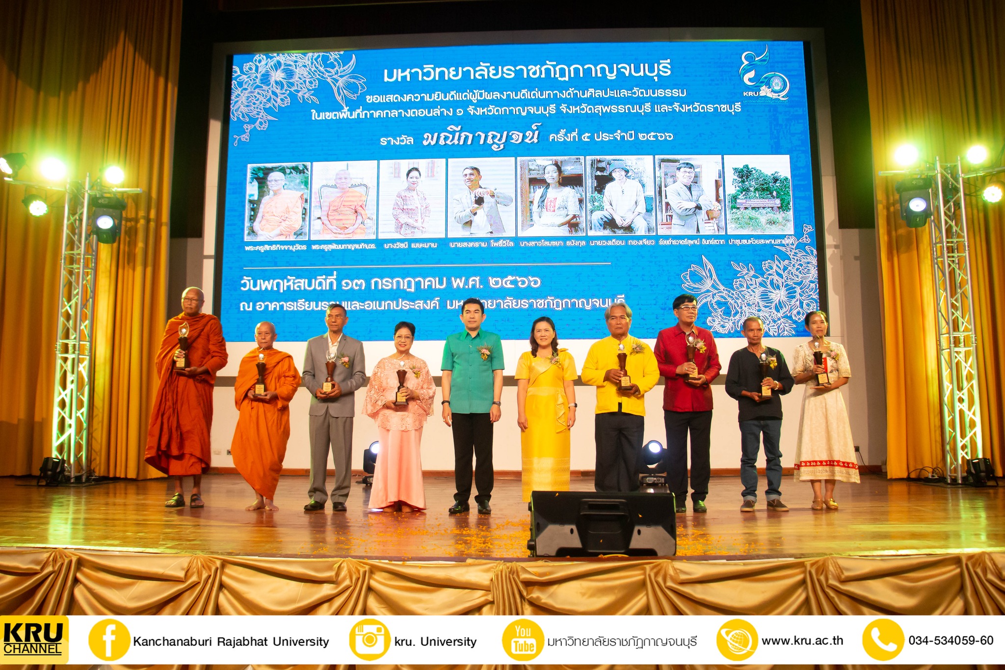 ภายในงานประกอบไปด้วยนิทรรศการ การรับชมวีดิทัศน์แนะนำมหาวิทยาลัยราชภัฏกาญจนบุรี การแสดงศิลปวัฒนธรรม วีดิทัศน์แนะนำผู้มีผลงานดีเด่นทางด้านศิลปะและวัฒนธรรม และพิธีมอบรางวัลผู้มีผลงานดีเด่นทางด้านศิลปะและวัฒนธรรม รางวัล “มณีกาญจน์” ทั้ง 8 ท่าน ได้แก่